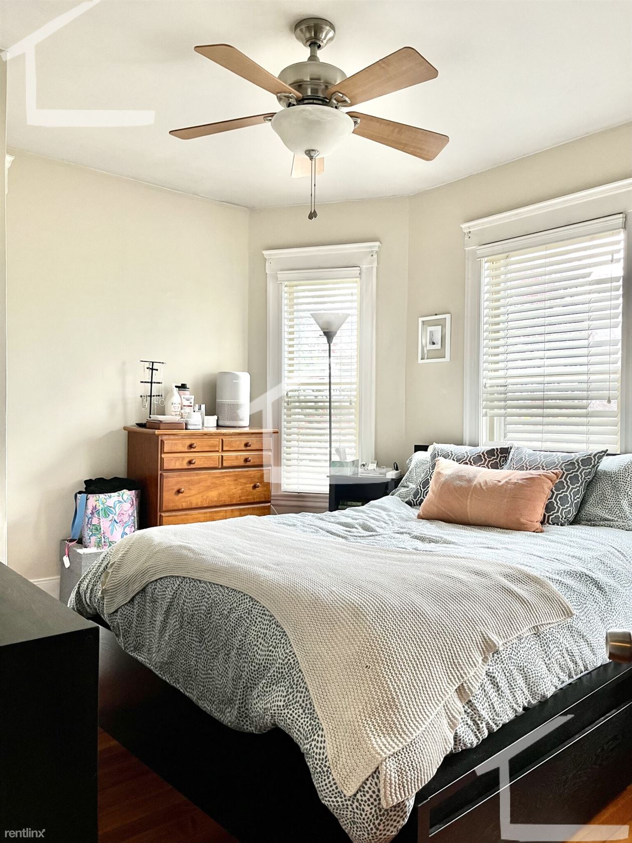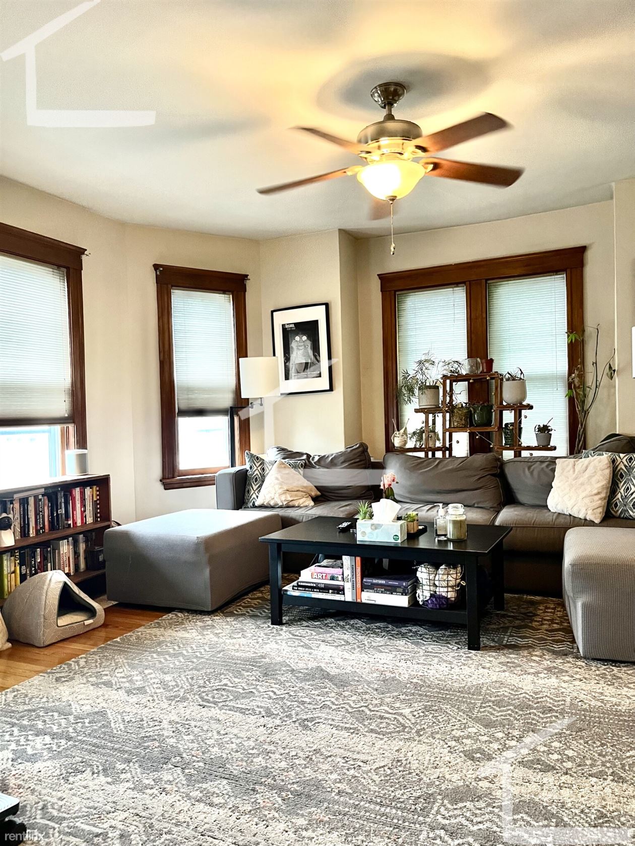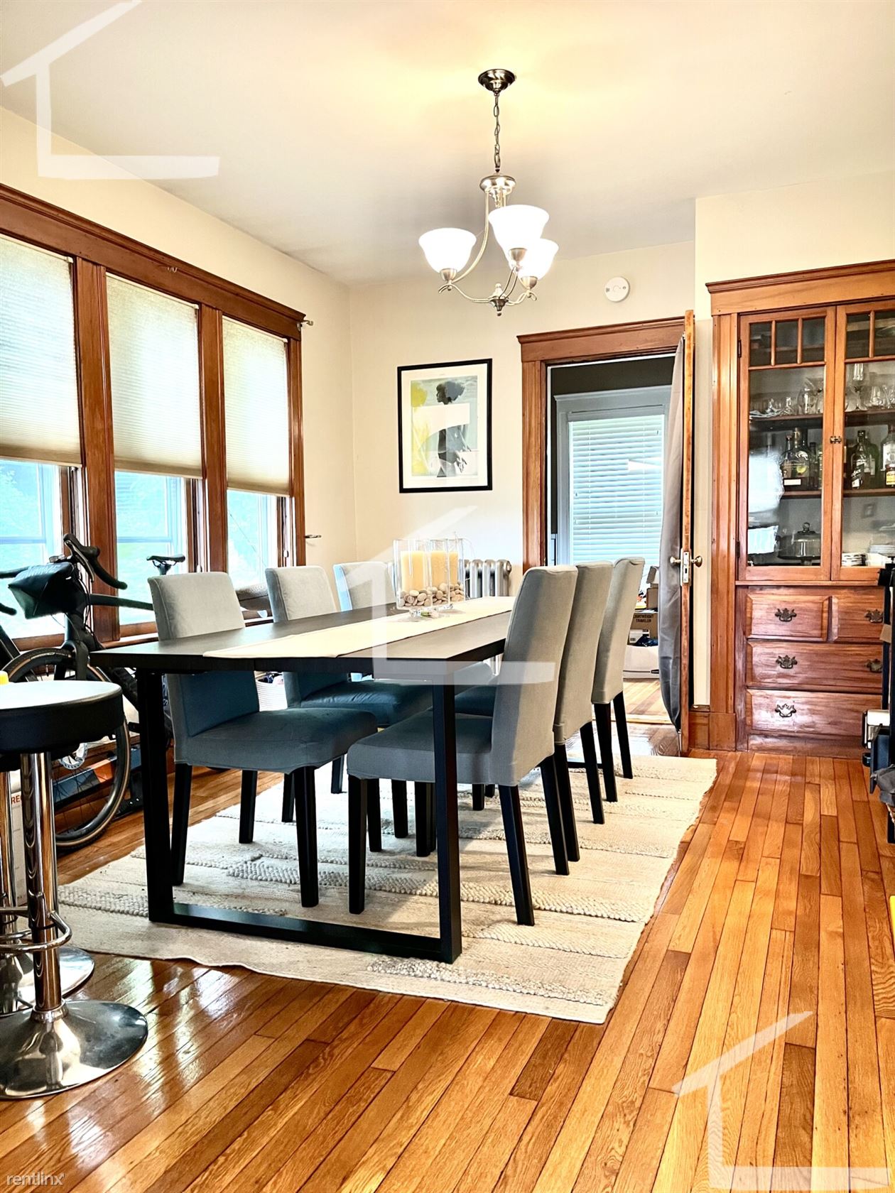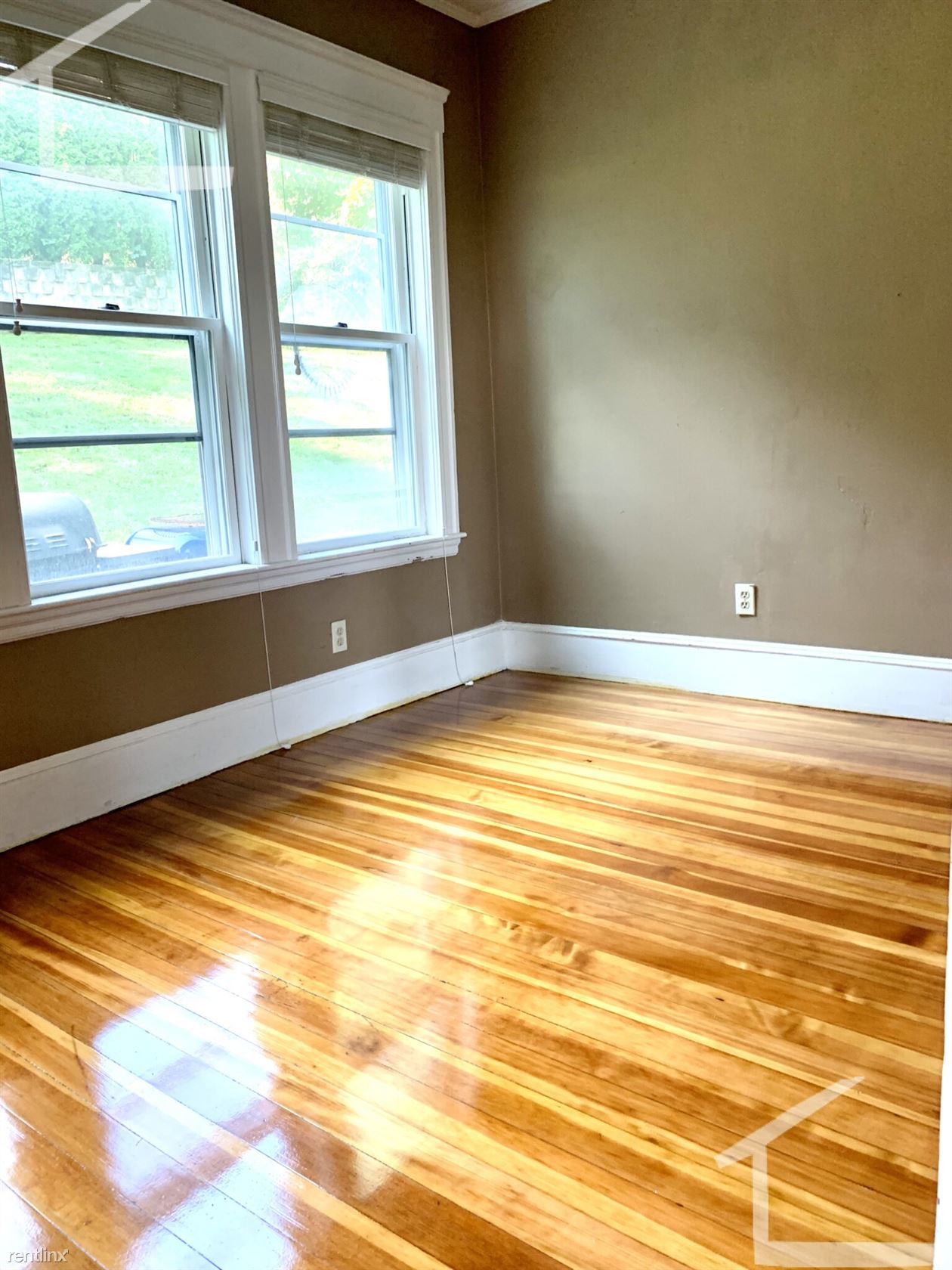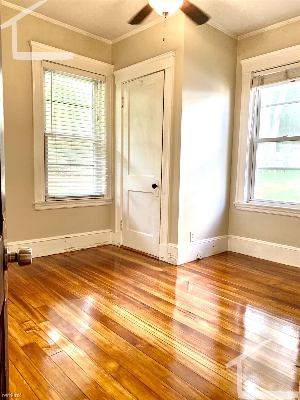 Custom blinds and refinished hardwood floors throughout